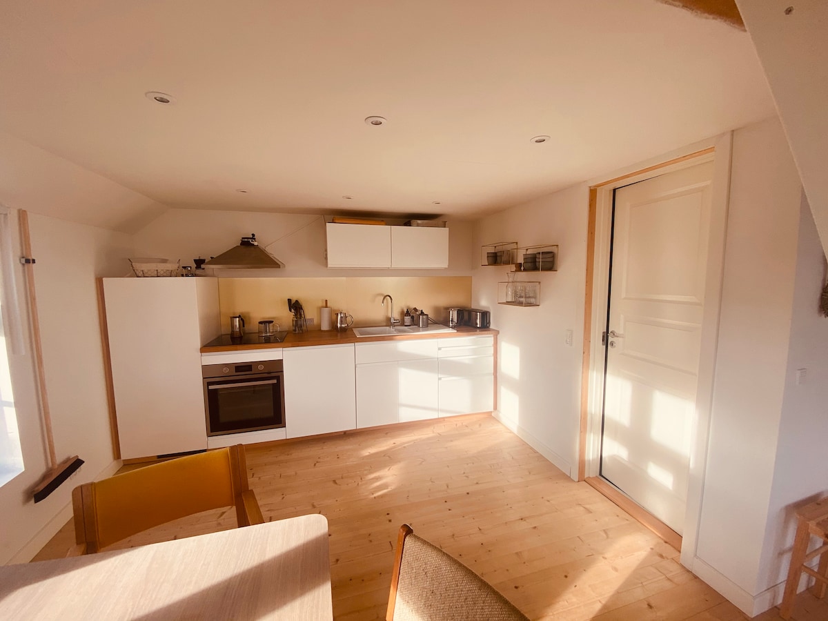 Oprindeligt opført som hestestald i 1832, er denne bygning nu ombygget til en charmerende bolig med eget køkken og toilet. Perfekt til en weekendtur eller et stop undervejs på cykelferien. I stueetagen finder du et åbent køkken og stue i ét, med adgang til en privat terrasse samt et badeværelse. På første sal er der et rummeligt værelse med fire enkeltsenge og udsigt over havet fra den ene ende af rummet. Boligen skal efterlades i samme stand som ved ankomst.