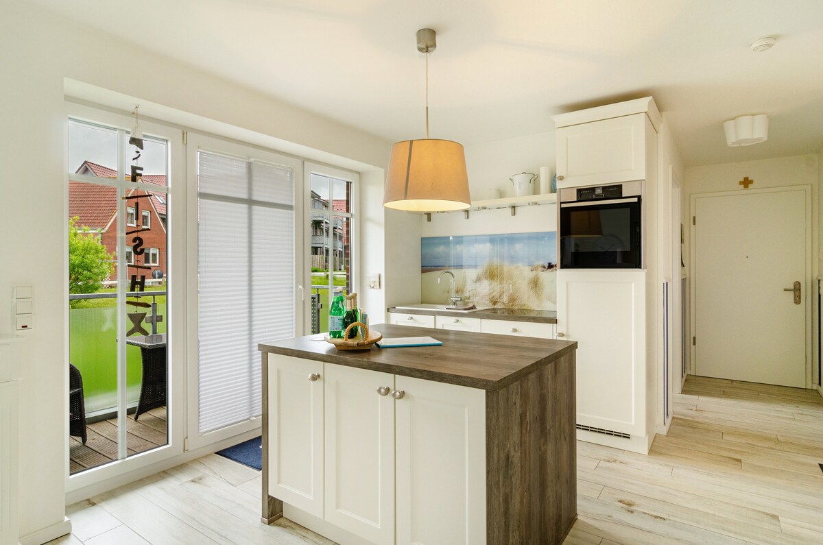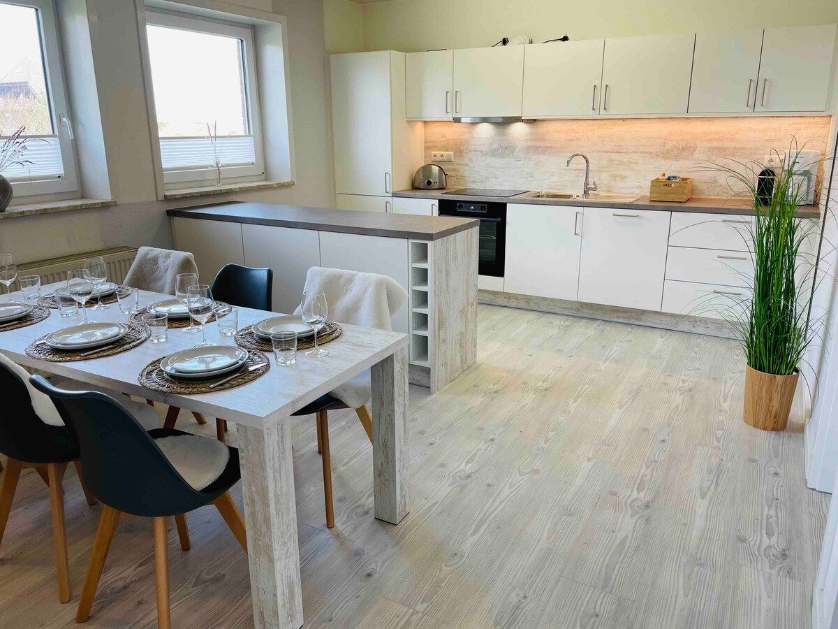 O nosso apartamento recém-renovado, moderno e espaçoso tem 3 quartos, 2 casas de banho completas e uma grande varanda divisível virada a sul e pode acomodar até 6 pessoas em 110m2. Nosso "Düne 77" está localizado em uma localização privilegiada absolutamente tranquila em Westdorf. Curtas distâncias para a cidade e a praia. O porto de balsas fica a apenas 6 minutos a pé.