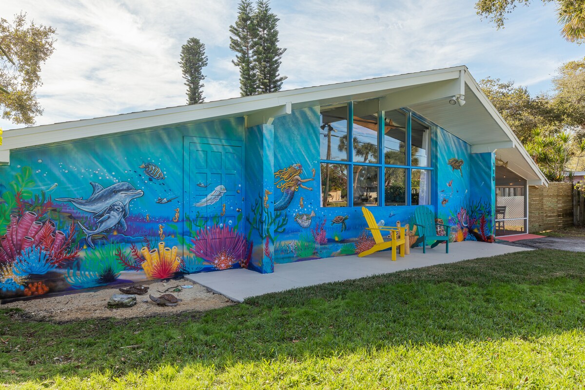 ❤️Tudo o que você precisa fazer é desfazer as malas e relaxar!❤️ Presenteie sua família com um dos 5% melhores Airbnb! Imagine as crianças rindo com prazer quando são recebidas em sua casa de férias por um mural extravagante. Espere até ver o enorme quintal...há tanta diversão que você vai se sentir como uma criança novamente! *Use a faixa de pedestres e caminhe até a praia * Pule na piscina * Jogue minigolfe * Relaxe nas redes * Cozinhe s'mores perto da lareira * Desfrute de caiaques e pranchas de remo * Surf & Body Board *Jogar jogos *Assista a um filme ao ar livre