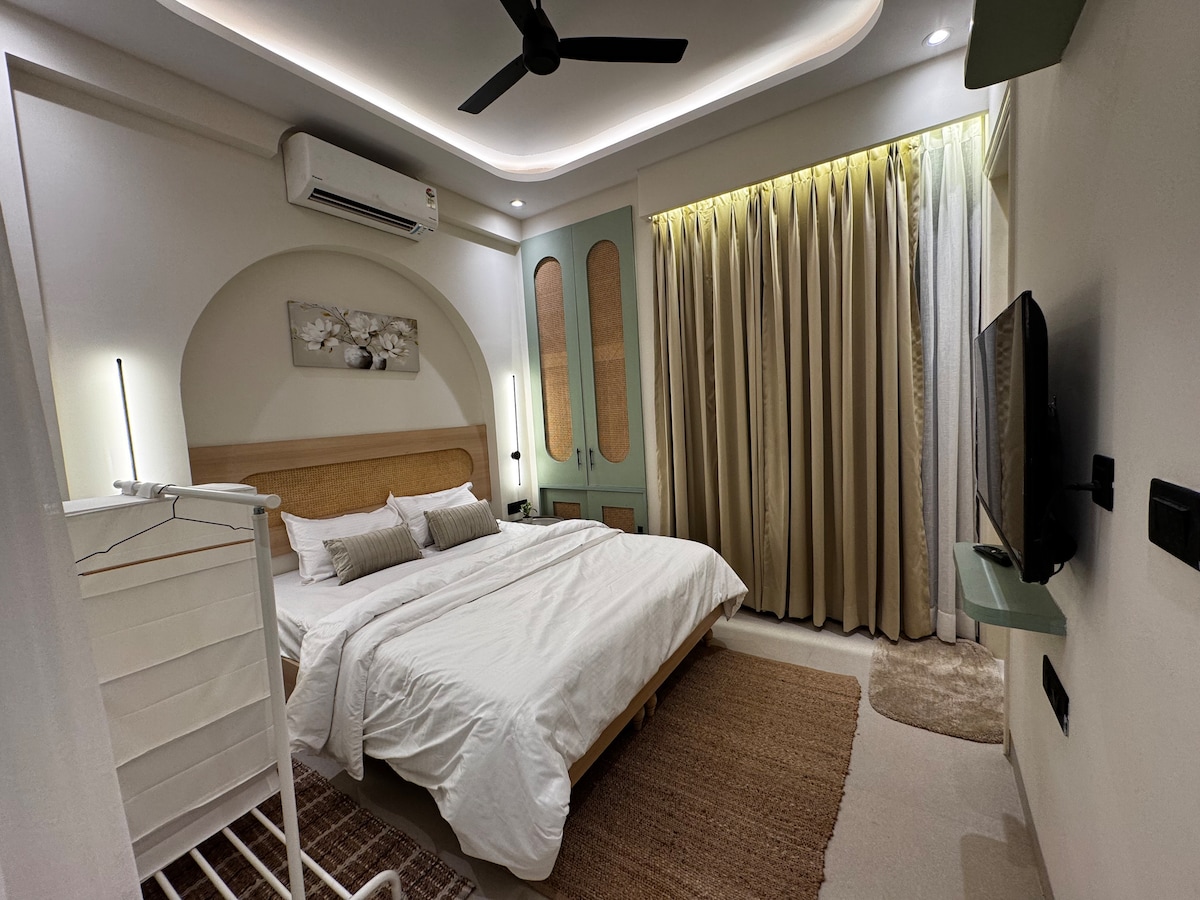 Luxe 1 BHK•Campo de golfe•Varanda Boho•Vista para a floresta