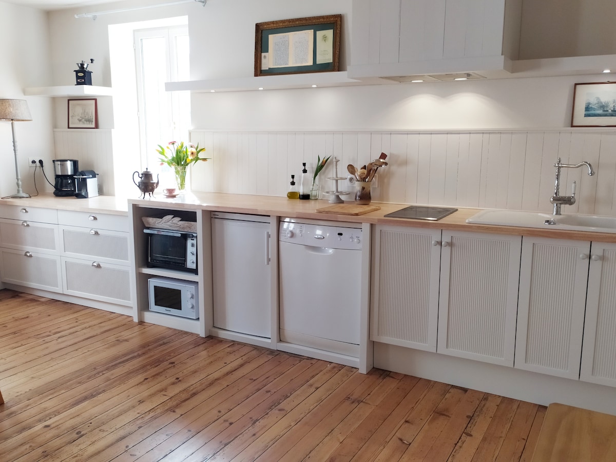 Casa de fazenda recentemente renovada pertencente à casa Manor por mar. Decorado com bom gosto pelo proprietário (pintor e arquiteto) - totalmente equipado com todas as necessidades nas férias - quartos confortáveis com banheiros privativos, terraço virado para o oeste com churrasqueira, máquinas de lavar e lavar roupa. Sala de estar ensolarada e espaçosa. Télévision, internet, sistema de música. O mar a 3 minutos a pé. Vila encantadora com mercado e supermercado a 4 minutos de carro da casa. Campo de golfe a 10 minutos de carro.