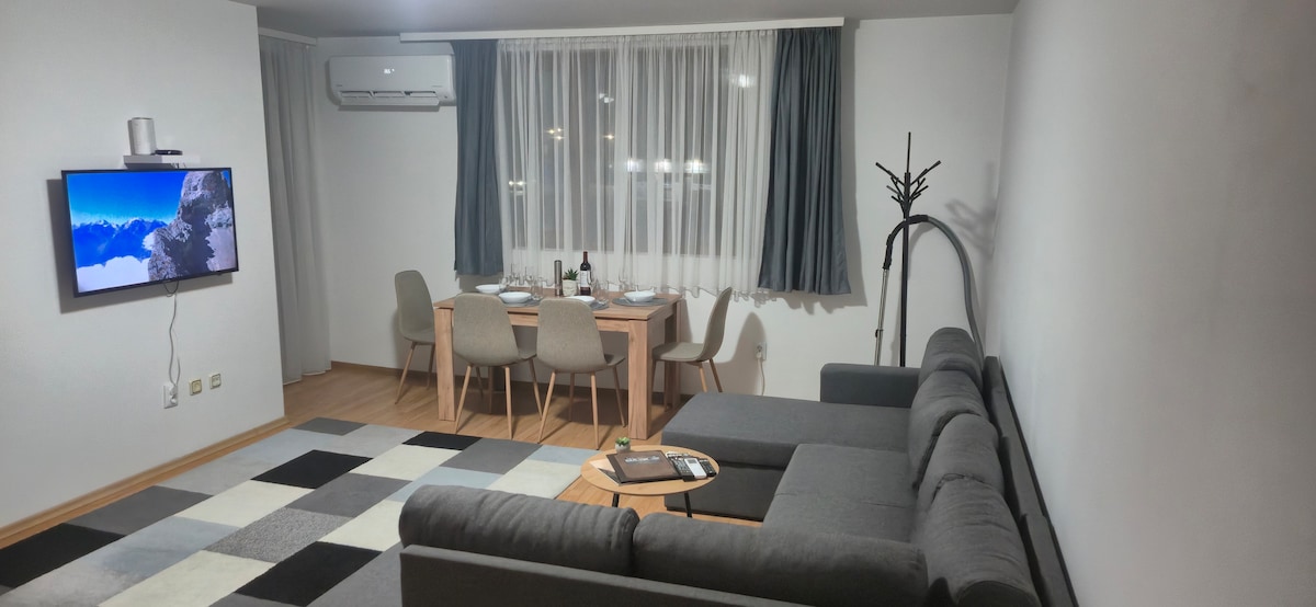 Um apartamento moderno e luxuoso de 2 quartos a apenas 5 minutos a pé do teleférico. Recentemente renovado para um padrão muito alto, oferece a grupos de até 5 pessoas a escapada de férias de inverno ideal. O espaço oferece um grande lounge com uma lareira para um ótimo final quente para o seu dia de esqui. Há 2 quartos espaçosos com camas de casal e um sofá-cama de casal confortável na sala de estar, um banheiro de alta especificação com um chuveiro de efeito chuva e uma varanda para desfrutar do sol da manhã e uma vista para a montanha Pirin.