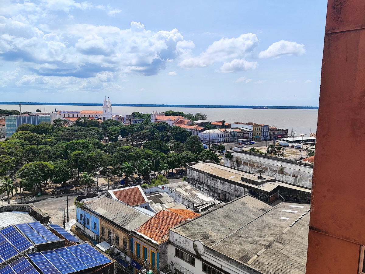 🌟Studio novo no histórico Ed. Palácio do Rádio (1956), marco da verticalização de Belém. No 9º andar, vista incrível para o rio e nascer do sol, sem janelas próximas — total privacidade. Cama de casal retrátil + sofá com 2 camas de solteiro, Smart TV 58”, internet 600 Mb, cozinha completa e banheiro moderno. Ao lado da área comercial com lojas e comidas típicas. Aqui você atravessa a rua e está no centro histórico. Acesso a pé ao ver-o-peso e estação das docas. No térreo: minimercado.