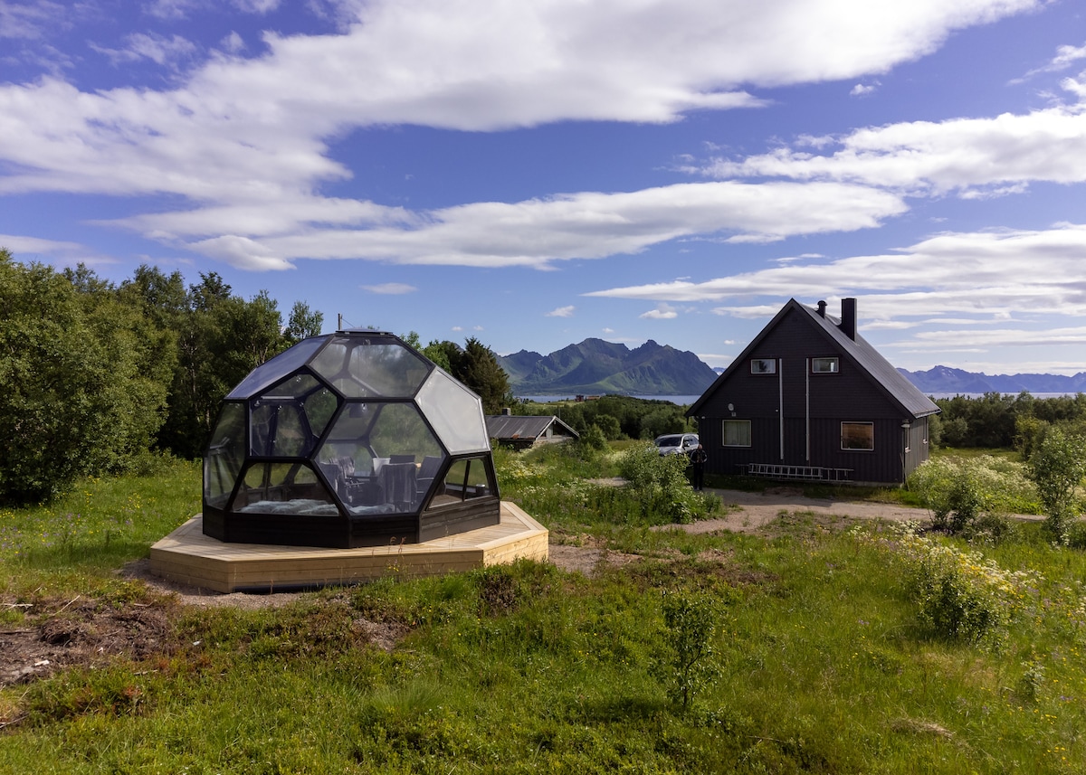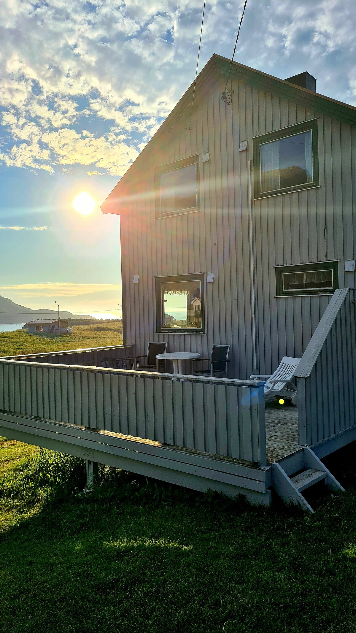 Bem-vindo à nossa acomodação tranquila no campo com uma varanda e belas vistas para as montanhas Lofoten, o mar, as luzes do norte e o sol da meia-noite. Apartamento próprio no 2º andar na garagem com varanda, banheiro, cozinha combinada e sala de estar com uma cama de casal para duas pessoas, um sofá-cama para duas pessoas e duas camas de hóspedes extras. Há também um sistema de cinema em casa. Curta distância de carro até Lofoten, safári de alces, fazenda de renas, observação de baleias e outras experiências na natureza.