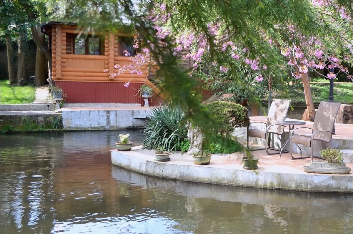 Banheira de hidromassagem e lago | Cabana de carvalho aconchegante