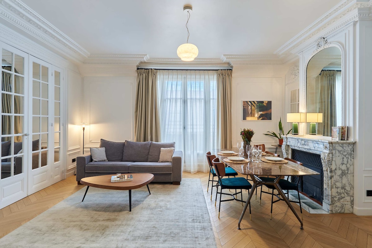 Luxurious apartment, with spacious rooms, ideally located for visiting Paris, at walking distance of Opéra, Galeries Lafayette, Montmartre and Champs-Elysées, and enjoying a neighborhood life with many restaurants. Ideal for 1 or 2 couples, but up to 6 people can sleep (2 bedrooms with queen size bed and a sofa bed in the living room) Appartement luxueux situé dans le 8ème arrondissement , idéal pour une grande famille ou plusieurs couples aimant l'espace.