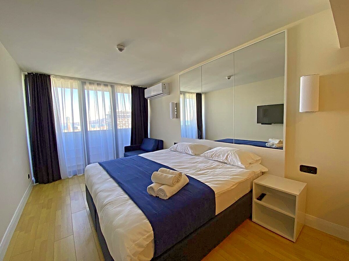 Sem fila em elevadores e recepção - NEW Block D2 estúdio com um design ainda mais conveniente, prático e elegante, está disponível para aluguel pela primeira vez. Procurando um estúdio onde ninguém tenha vivido antes? A localização única do apartamento oferece vistas deslumbrantes para o mar, que se estende desde a nova parte da cidade até o porto na cidade velha e um panorama deslumbrante das Montanhas do Cáucaso do outro lado. Comodidades: geladeira grande, máquina de lavar roupa, forno de micro-ondas, forno, cafeteira