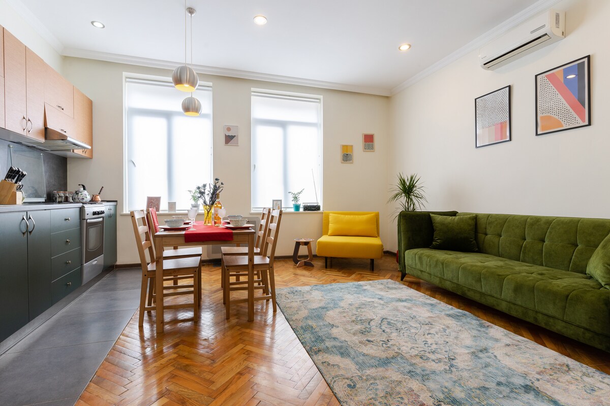 Apartamento moderno de dois quartos de 60 metros quadrados no centro de Batumi com vista para a mesquita e as ruas da cidade velha. Confortavelmente localizado no segundo andar de um edifício de dois andares em um pátio colorido. Perto do porto, do cais, dos melhores cafés e restaurantes da cidade, a 7 minutos a pé da praia. Apartamento moderno de 60 m2 com um quarto e uma espaçosa sala de estar no centro de Batumi com vista para a mesquita e as ruas do centro histórico. Localizado confortavelmente no 2º andar de um edifício de dois andares em um pátio pitoresco.