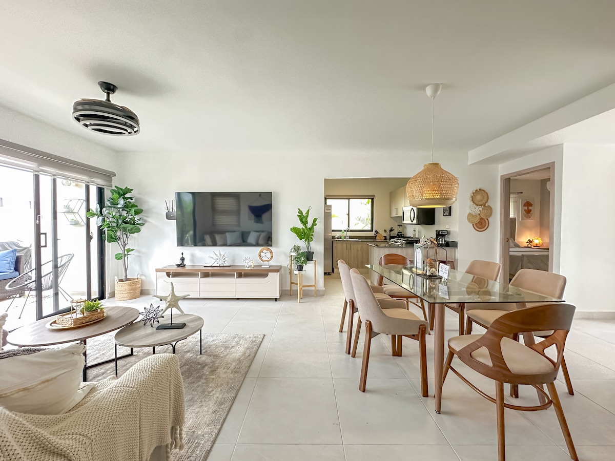 @VillasNurys dois andares no coração de Punta Cana. 5 min. de Coco Bongo, entre 10 e 15 min. de praias e aeroporto. Este retiro tropical totalmente mobiliado oferece um refúgio exclusivo. Desfrute de uma única noite de picuzzi privado, parrilladas, junte em família e deliciosas gastronomias e atividades de Punta Cana. O interior tem uma decoração de inspiração caribenha e espaços espaçosos: dois quartos e um sofá-cama adicional oferecem toda uma possibilidade. Como em casa!