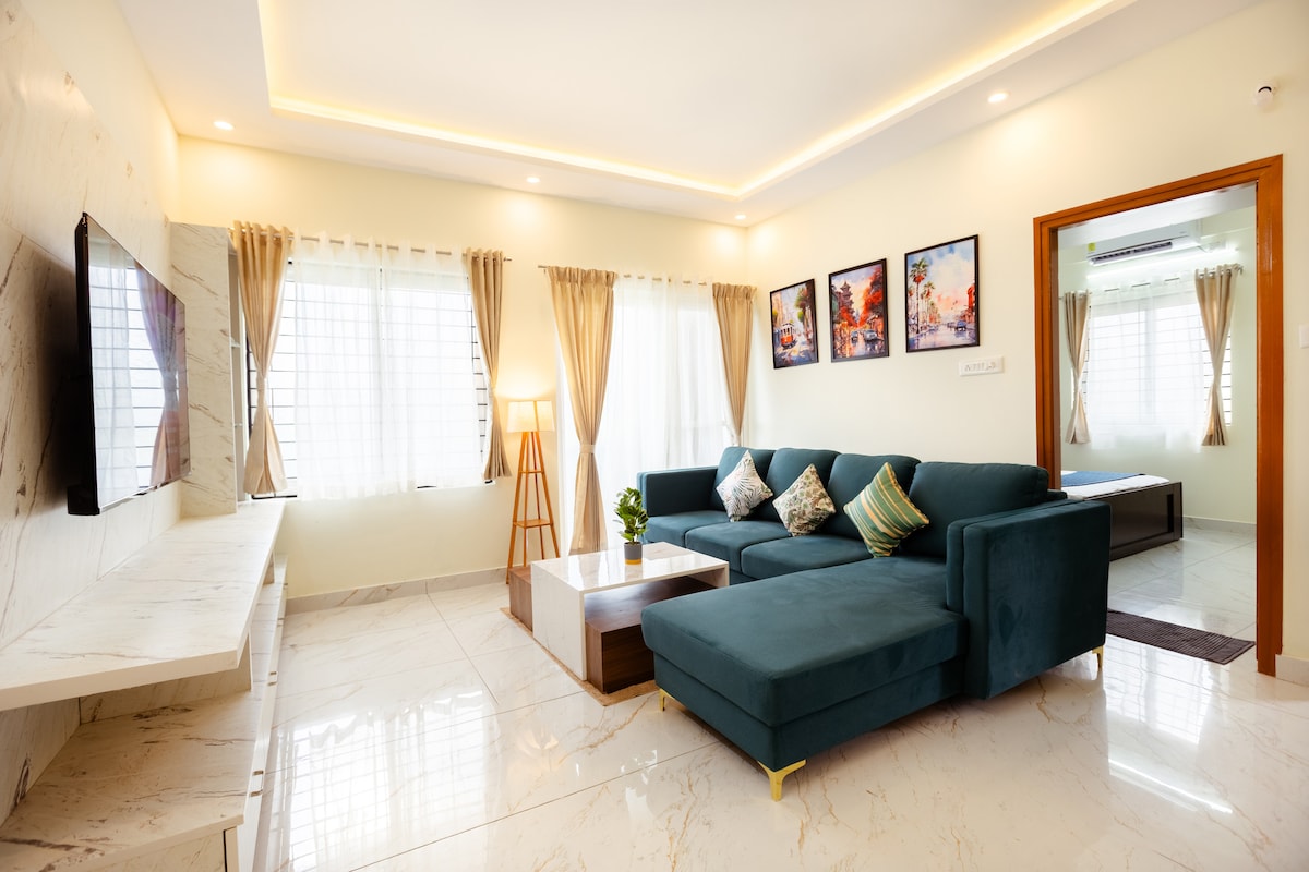 Fique em um elegante 1BHK na Hosapalya Main Road com quarto com ar-condicionado, vista para a varanda, Wi-Fi, Smart TV, elevador e backup de energia. Desfrute de uma cozinha totalmente equipada com indução, geladeira, utensílios e especiarias, além de lanches de cortesia. Perto de HSR Layout, Koramangala e Electronic City, com fácil acesso a cafés, mercados e transporte. Ideal para viagens a trabalho, famílias ou estadias individuais.
