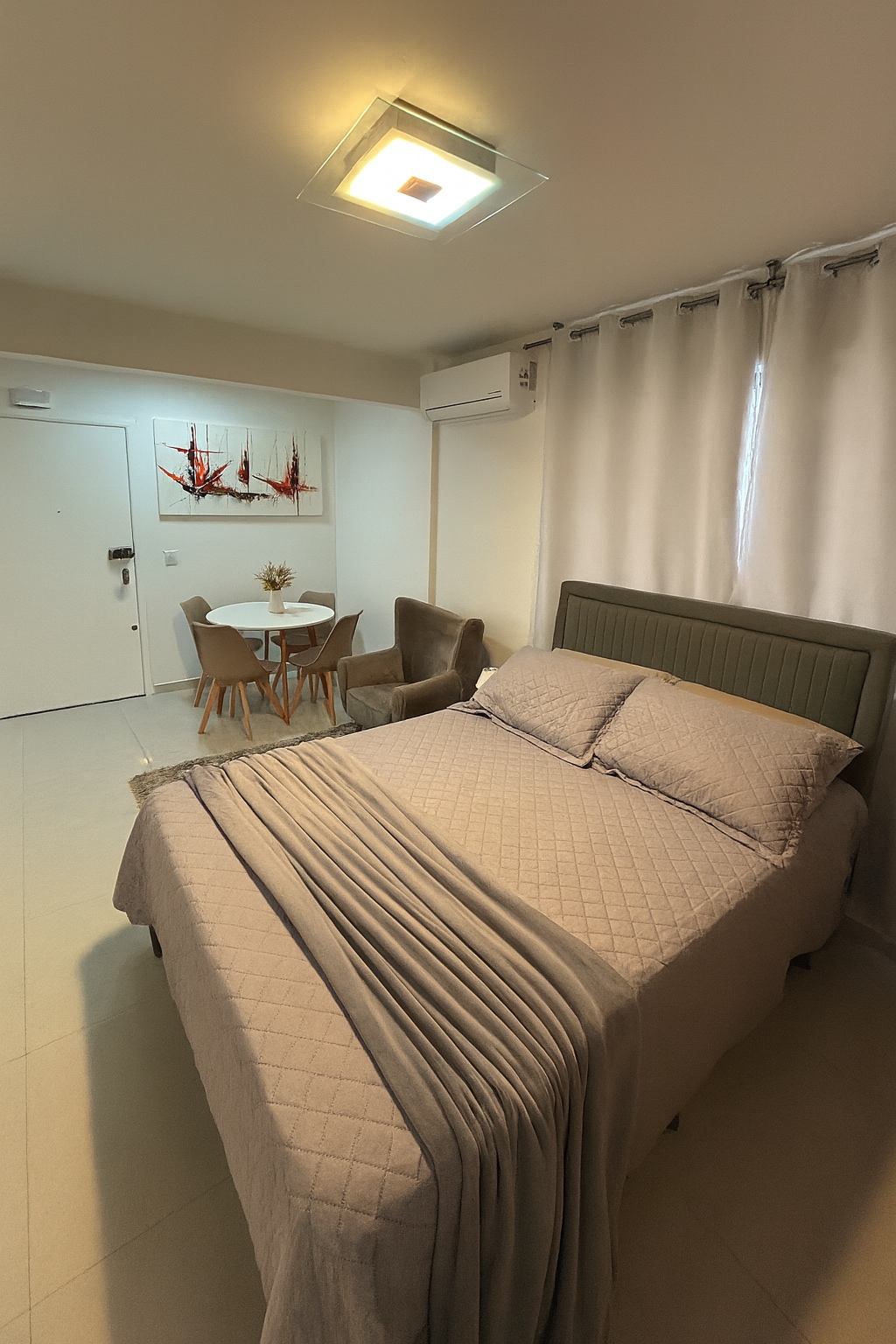 * COLCHÃO DE ALTA QUALIDADE * CHUVEIRO À GÁS * BANHEIRO EXTREMAMENTE LIMPO E HIGIENIZADO. * SMART TV LG DE 50" Apartamento studio central com câmeras de segurança no prédio. Completamente mobiliado. Silencioso ao fechar as janelas, escuro ao fechar as cortinas. Academia a disposição. Garagem com fácil acesso e que permite caminhonetes do tipo HIlux, Ranger Raptor, Amarok... Na rua gastronômica: próximo de vários tipos de lanches e de excelentes restaurantes.