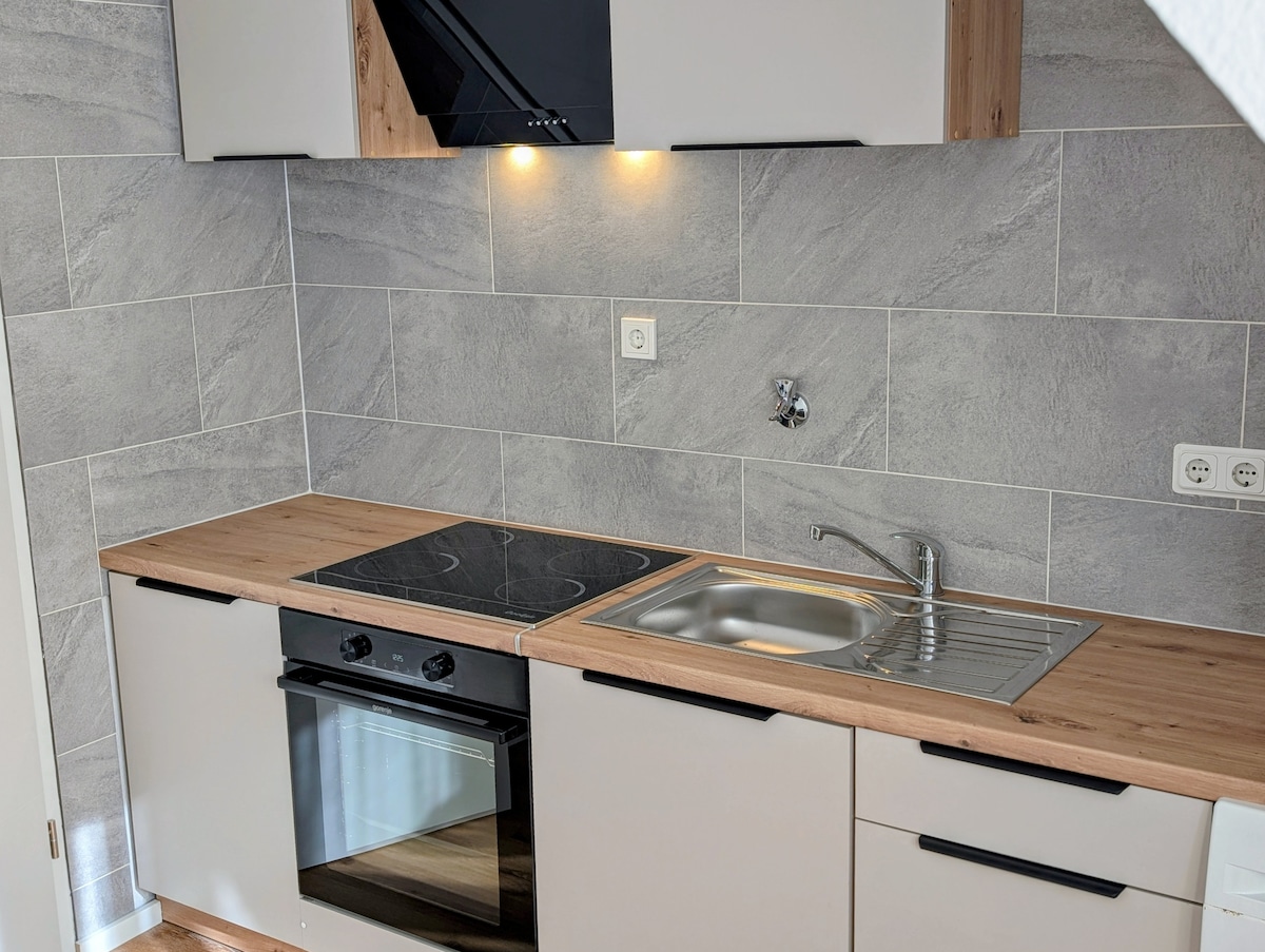 Neste espaçoso apartamento novo você pode passar férias relaxantes. A grande sala de estar com cozinha totalmente equipada convida a relaxar. O sofá-cama oferece dois lugares para dormir. O quarto adjacente inclui uma cama espaçosa de 2x2 m e um grande guarda-roupa. O banheiro está equipado com uma banheira e um chuveiro. Há uma máquina de lavar roupa na despensa. Entrada privativa e estacionamento gratuito disponíveis na casa.
