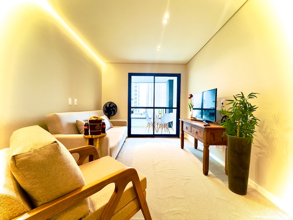Relaxe neste espaço de bom gosto, conforto e tranquilidade. * Sala c/vista Mar e por do sol * Cozinha equipada p/a preparação de um jantar de chef, como p/um lanche rápido. Louças, taças, panelas, airfreyer * Banheiros c/ducha a gás * Suíte: Acorde olhando o mar, cama Queen, colchão king koll, muito confortável * Quarto/Escrit. Bancada p/trabalho c/ vista mar e Cama casal box * Smart TV c/assinatura de canais * Internet * Ar Condicionado em todos os cômodos Um luxo