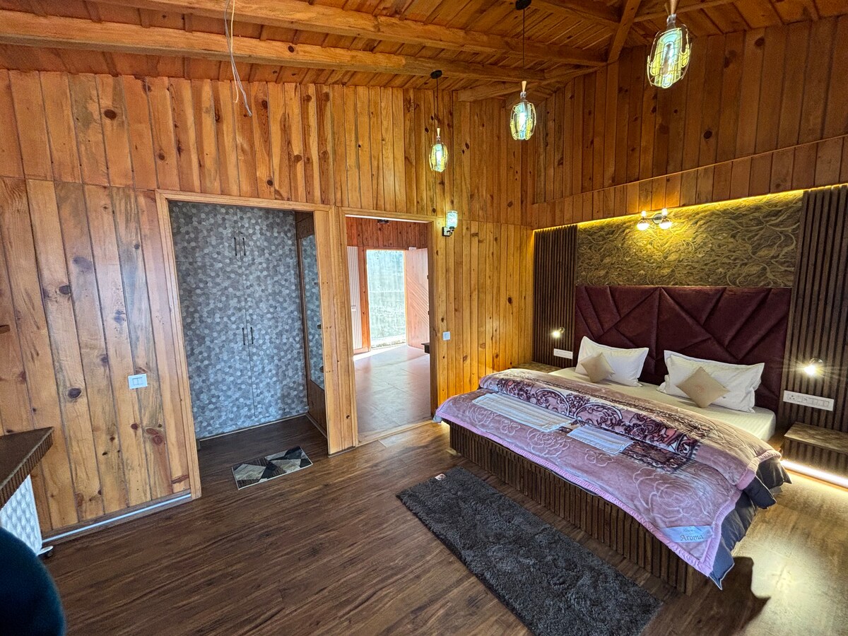 Construído em forma de um chalé moderno, ofereça 3 quartos conectados com banheiros anexos. Famílias grandes e grupos de 8 a 10 amigos podem alugar esta cabana inteira de forma independente, de acordo com sua conveniência. Todos esses quartos são construídos no chão e todas as portas se abrem para o jardim do resort. Estes quartos têm todas essas instalações disponíveis para os hóspedes, como - camas premium, TVs de LED, armários, mesas, cadeiras, interfones, ventiladores e banheiros modernos anexos