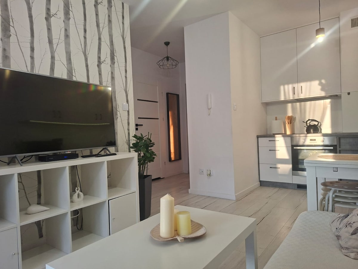 Mieszkanie na I piętrze w nowym budynku z windą. Nowocześnie i w pełni urządzone, komfortowe i bardzo przyjemne do pobytu. Oprócz sypialni jest też pokój z pojedynczym łóżkiem i możliwość spania na rozkładanej kanapie Jest dodatkowo balkon typu loggia oraz miejsce postojowe w garażu podziemnym. We speak English, French, Italian and some Hebrew :)