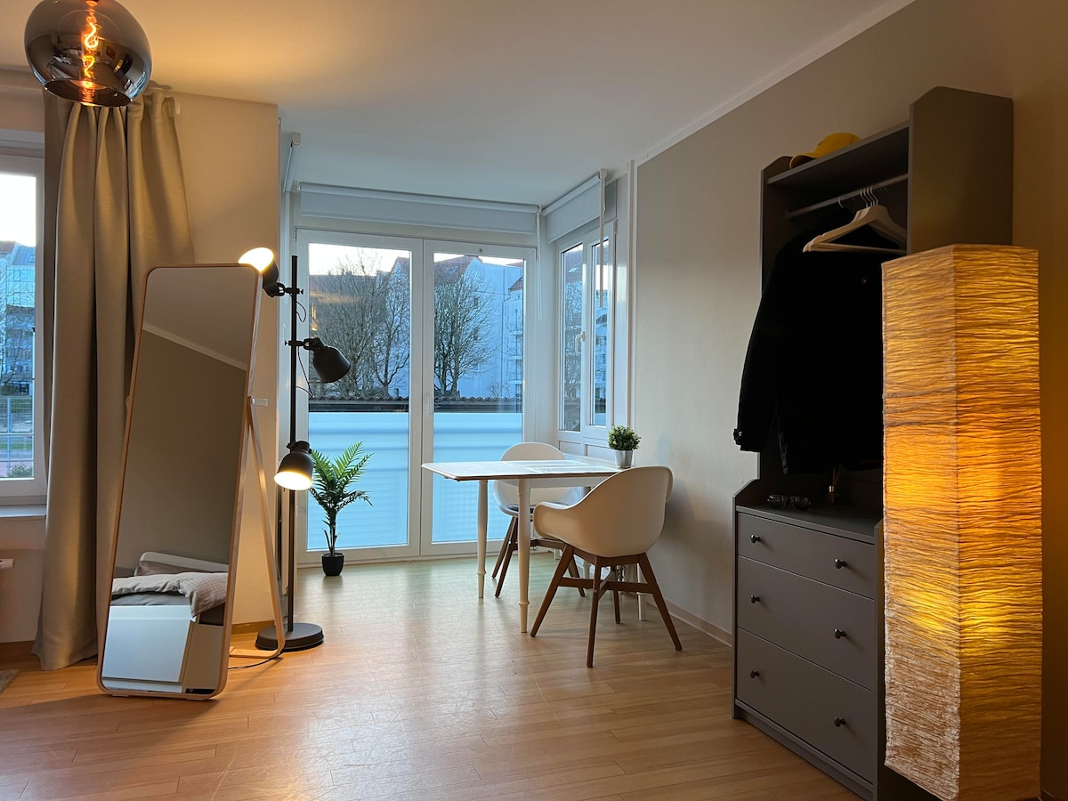 O apartamento estúdio totalmente mobiliado tem localização central e se destaca por sua orientação em direção a um pátio interno tranquilo. Além disso, fica a apenas 6 minutos a pé da estação ferroviária principal. Este apartamento possui comodidades modernas, móveis confortáveis e uma cozinha totalmente equipada. É ideal para solteiros ou casais que procuram um lugar aconchegante e elegante para ficar.