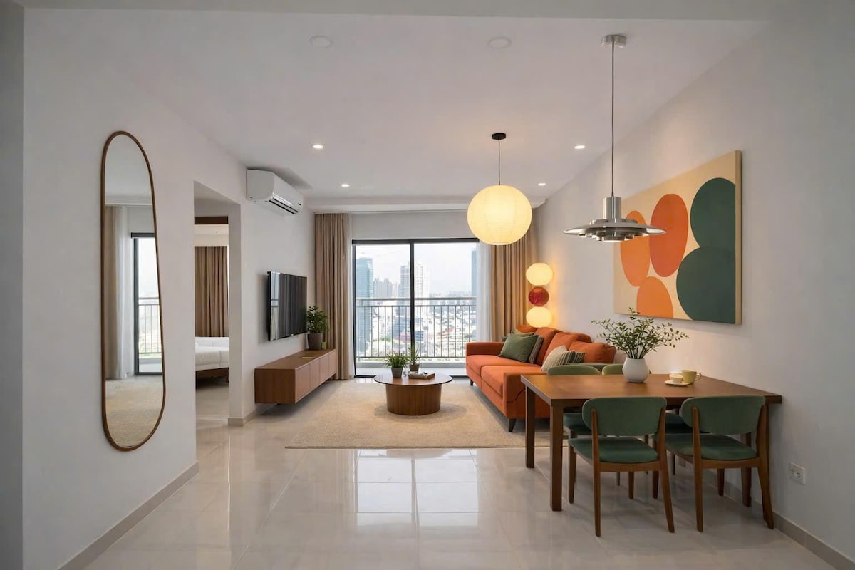 Luxo 5* The Opera Residence Corner Apartment by ChiHome - River View Bason District 1, The LandMark 81, The Galleria, The Mett Office, District 2 Sala Thiso Mall. - Torre B, Escada, Nível 1x unidade 10 - Tamanho: 70 m² (unidade de canto) - Inclui 2 quartos, 2 banheiros, confortável para ficar de 2-4 pessoas. - Smart TV de 65 polegadas com Netflix e YouTube - Sofá, poltrona, mesa de chá. - Mesa de jantar 4 cadeiras - Utensílios de cozinha completos - Internet sem fio de alta velocidade disponível • Ar condicionado para toda a casa - Acesso 24 horas, 7 dias por semana ao prédio