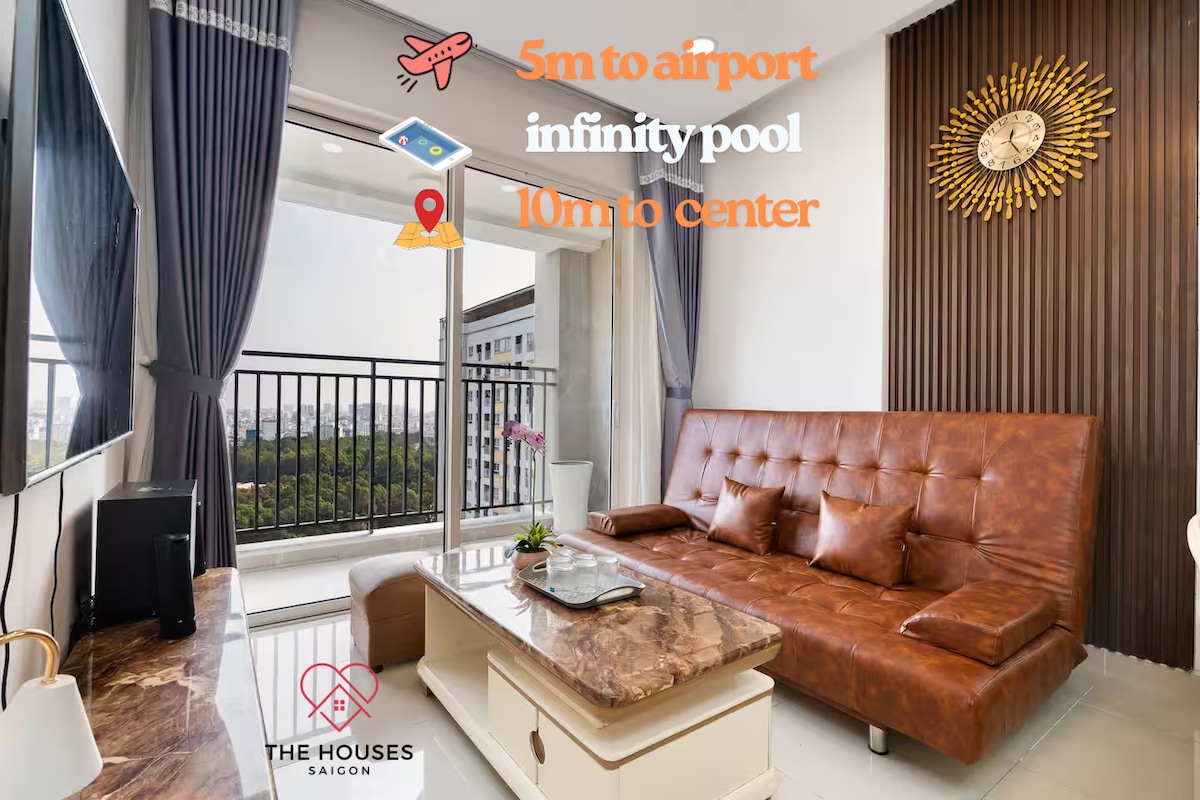 A bright, modern, and fully-equipped apartment designed for the modern traveler. Enjoy the comforts of home with the amenities of a luxury building. Proximity: 5 minutes to Tan Son Nhat Airport (SGN). Bedding: 3 Queen beds – ideal for families or groups of 6. On-Site: Circle K, Phuc Long Coffee, and various dining options at your doorstep. Entertainment: 65" Smart TV + Netflix + High-speed Internet. Recreation: Free access to the swimming pool and gym.