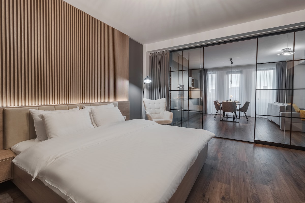 Descubra um espaço ultramoderno e versátil, a apenas 350 m (5 min) da Praça Unirii. A peça central é a parede de vidro que separa o quarto da sala de estar, equipada com cortinas opacas para total privacidade. Ideal para até 4 pessoas, este apartamento oferece uma mistura perfeita de estilo e funcionalidade. - Cortinas blackout para controle de luz - Estacionamento subterrâneo incluído (acesso seguro) - Sofá extensível na sala de estar - Banheiro moderno com chuveiro e Smart TV - Self Check-in e Wi-Fi ultrarrápido.