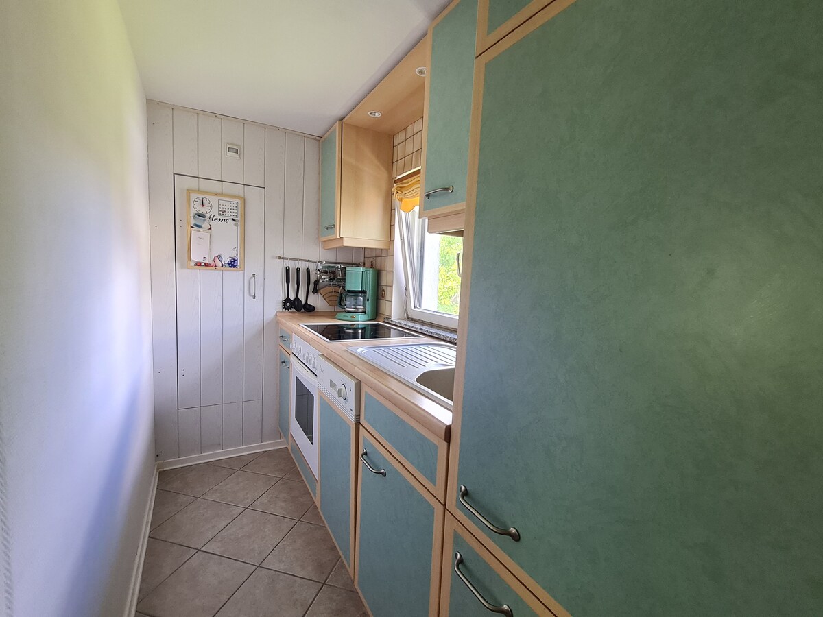 O apartamento de 74 m² é um apartamento duplex com corredor, sala de estar, 2 quartos, cozinha, banheiro e uma grande varanda. É possível fumar apenas na varanda ou na área externa (apartamento para não fumantes). Ao ar livre, há um grande jardim com piscina/casa de piscina (sazonalmente utilizável) e espaço para fogueira e churrasco. Garagem e vaga coberta disponíveis. Wi-Fi, lojas no local, uso da sala de chá possível após consulta.