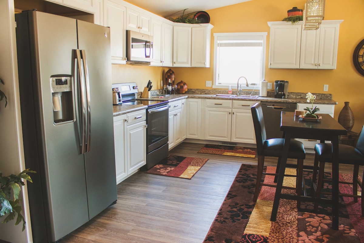 Apartamento de luxo de 1400 pés quadrados. Todos os eletrodomésticos, incluindo máquina de lavar e secar roupa. Internet rápida e TV a cabo. Perto de hotéis, mercearias e da Cervejaria Schells a uma curta distância a pé. Ciclovia pavimentada do outro lado da rua. A suíte é perfeita para pessoas que trabalham vindo para New Ulm precisando de um lugar muito confortável para ficar a curto prazo ou mais. Também é ótimo para viagens de fim de semana. Às vezes somos flexíveis com o número de hóspedes. Se mais de 3, aprovação prévia é necessária. A 2ª cama é um futon em um quarto pequeno.