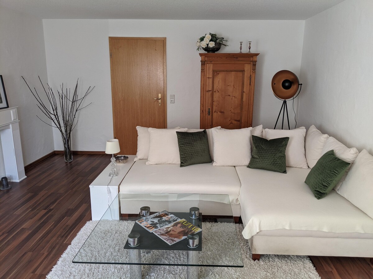 Wellcome no nosso moderno apartamento DG mobilado com belas vistas do Hegauberge. Um apartamento de aproximadamente 80 metros quadrados e luminoso espera por você: com cozinha equipada (incluindo máquina de lavar louça, fogão elétrico com forno, geladeira/congelador e cafeteira); ampla sala de estar com TV e área de jantar e varanda coberta; quarto grande com cama de casal e cama de solteiro (se necessário, também um berço de bebê); banheiro pequeno com chuveiro e vaso sanitário.
