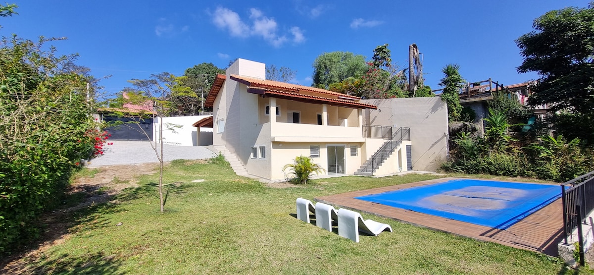 Chácara com piscina aquecida e churrasqueira, excelente espaço para descansar com a família, casa bem espaçosa, com cinco quartos, sendo duas suítes. A casa possui uma vista maravilhosa, pois ela se localiza numa parte mais alta do bairro. Conta com uma grande garagem que acomodam 4 carros facilmente.