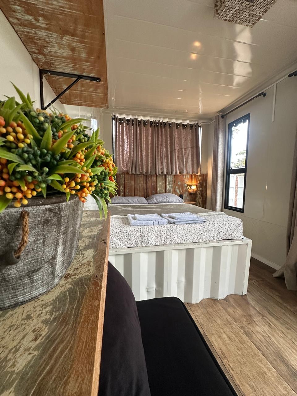 Estúdio compacto para casal em casa container. Sala, cozinha e quarto integrados, com banheiro privativo. Estilo moderno e aventureiro, para casais que buscam vivências e não luxo. Não falta água durante todo o ano. Localizado a 1,2 km da praia de Zimbros. Possui ar condicionado quente e frio. Jacuzzi aquecida a disposição dos hóspedes.