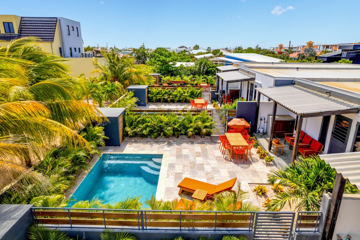 Esta acomodação com localização central e totalmente gelada não é apenas decorada com bom gosto, mas também oferece vistas deslumbrantes e piscina privada. Espaçoso terraço coberto com área de estar e mesa de jantar. A propriedade está localizada na água, uma lagoa onde o Mar do Caribe flui e com seu próprio cais. Não se preocupe com o aeroporto, é um aeroporto pequeno e você não terá notícias dele! Vantagem: as praias de TeAmo e Donkeybeach estão a uma curta distância a pé.