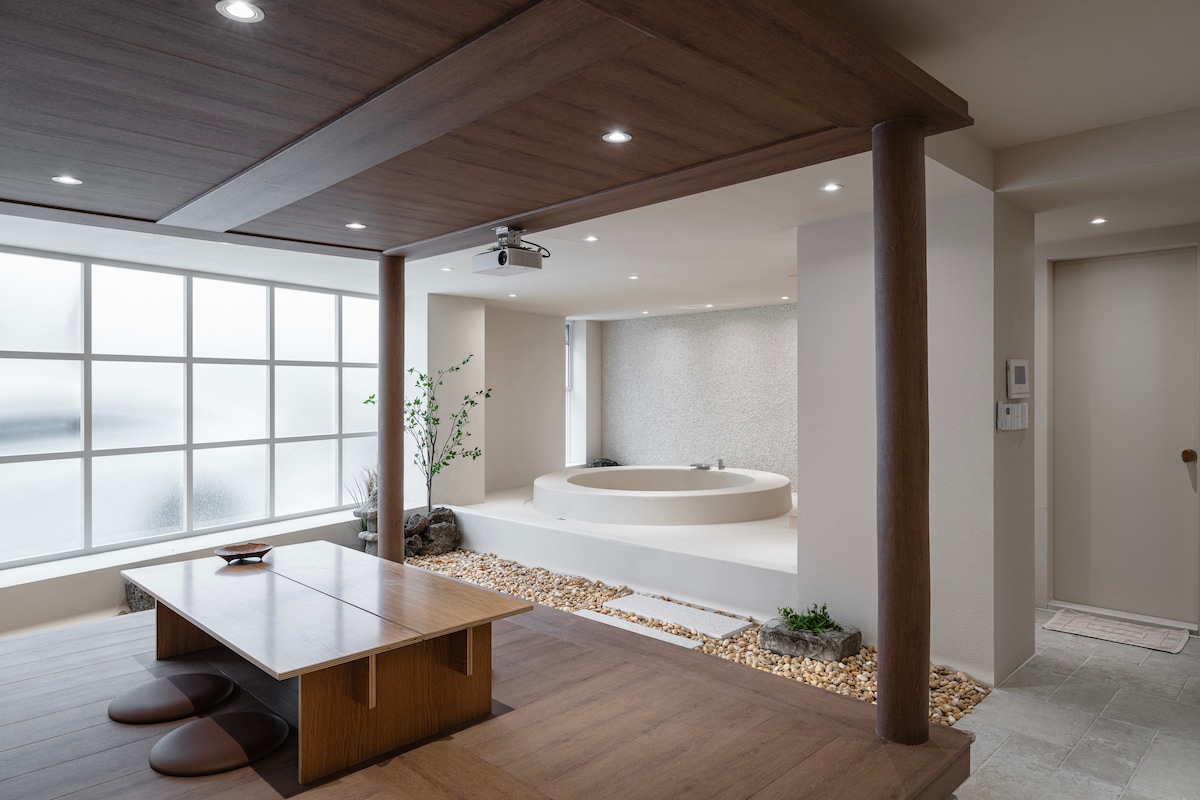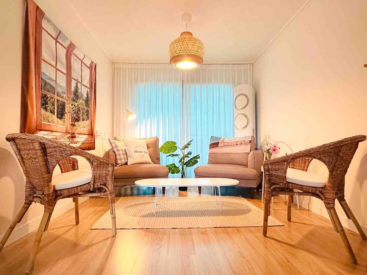 Acima de tudo, é o maior atrativo desta acomodação poder desfrutar de um churrasco no centro da cidade. O terraço está localizado bem na frente da sala de estar, então há um espaço onde você pode relaxar e tomar uma xícara de chá em silêncio. É uma acomodação divertida para assistir filmes no sótão com um projetor. É um espaço de pouco mais de 79m², então é espaçoso o suficiente para 2 pessoas. Se você gosta de plantas, também poderá sentir a sensação de estar em meio a um jardim. Se você caminhar cerca de 2 minutos do alojamento, é bom passear pela praia e há um local de aluguel de bicicletas operado pela cidade, então é recomendável andar de bicicleta na floresta de juncos. Se você for até a aldeia Hanok, poderá devolvê-la lá. A cerca de 10 minutos a pé, há também o Deokjin Park, que é famoso por ser um ponto turístico noturno. Acho que o mais importante em qualquer viagem é ter um alojamento aconchegante e confortável e que seja limpo. Prepararemos tudo para que você possa se sentir em casa. O custo do churrasco é de 20.000 wones, e fornecemos carvão, grelha, tocha, papel alumínio, etc.