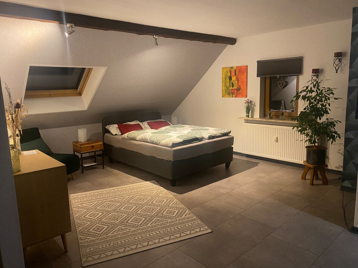 Maravilhoso apartamento no último andar (130 m²) no coração da região vulcânica de Eifel, em Mehren/Daun. Local ideal para caminhantes/ciclistas que desejam descobrir as crateras e a trilha Eifelsteig, um oásis para relaxar. Ampla sala de estar e jantar que leva ao maravilhoso jardim de inverno com lareira e ao terraço com móveis de jardim confortáveis. Vista para a cidade e o vale. Cozinha totalmente equipada. Ambos os quartos com camas de casal (160 cm). Do quarto maior há acesso ao terraço. Estacionamento diretamente na casa. Crianças são bem-vindas.
