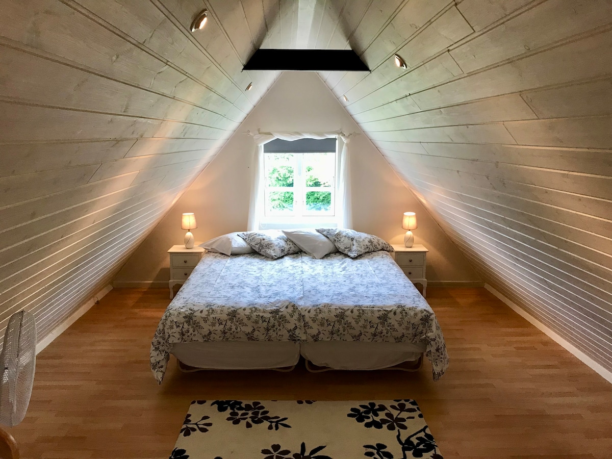 Sótão recém-reformado, bem iluminado e encantador, com cama de casal / 2 camas de solteiro + 2 colchões no chão, além de um sofá, com bela vista dos campos até Østerlars Rundkirke. Pátio aconchegante com mesas/bancos e pores do sol encantadores. Aqui é tranquilo e silencioso e fica a apenas 6 minutos a pé do mercadinho e do ônibus em Østerlars. Fica a 6 km da encantadora Gudhjem, com uma costa rochosa, cafés e restaurantes. O café da manhã não está incluído, mas você pode usar a cozinha para preparar um café da manhã leve.