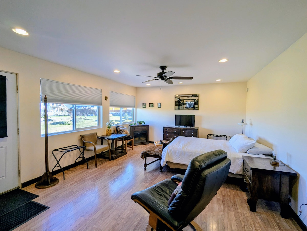 Cozy Studio Guest House fica no final da rua (cerca de 2 milhas) do Aeroporto Internacional de Bozeman Yellowstone e I-90. Convenientemente localizado entre Bozeman e Belgrado. Você terá a garagem inteira para estacionar seu veículo, incluindo o quintal, só para você - Não compartilhado! Belas vistas para o vale e para as montanhas podem ser vistas ao longe.