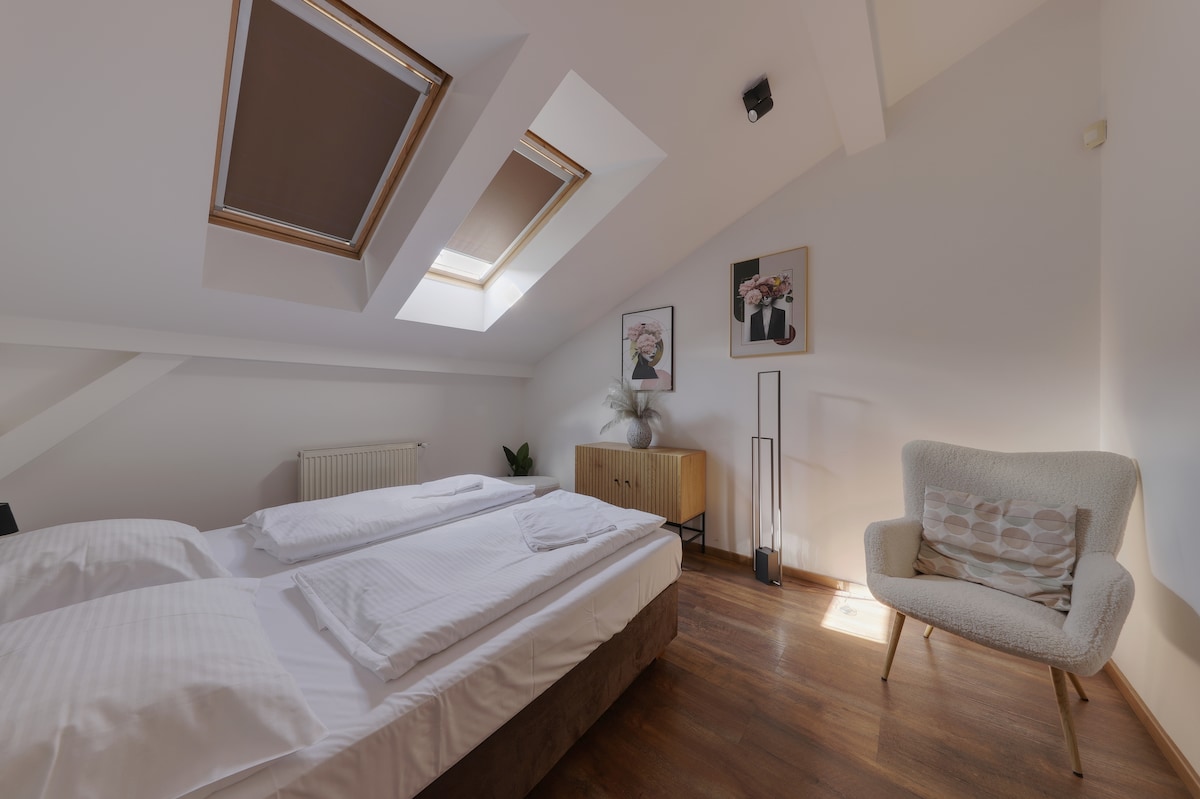 Relaxe neste lugar único e tranquilo perto de um parque florestal com excelente acesso ao centro da cidade. O apartamento está localizado no terceiro andar de um prédio residencial - um edifício novo com elevador e estacionamento gratuito na garagem. Está totalmente equipado, com persianas externas e ar condicionado. O terraço tem uma vista maravilhosa para o parque e para Bratislava. A localização é muito boa, a 7 minutos de uma parada de ônibus com várias conexões, ou a 5 minutos de táxi. Você vai se sentir em casa.