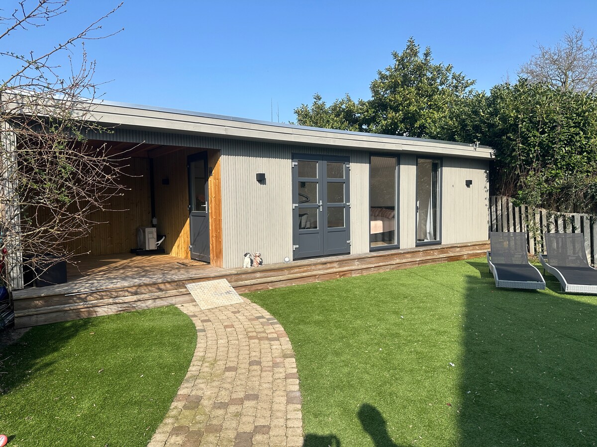 Sinta-se bem-vindo! Esta espaçosa casa de campo com entrada privativa está localizada atrás da nossa casa (do outro lado do nosso rico jardim). ♡ Sala de estar com lareira a gás, cinema, cozinha com geladeira/forno combinado/chaleira/ fogão, banheiro com chuveiro de efeito chuva, um mezanino com cama de casal Terraço ♡ espaçoso com guarda-sol, móveis de jardim e churrasqueira ♡ Sauna e banheira de hidromassagem por um custo adicional (€ 45) ♡ 15 minutos a pé do Mercado de Haia (restaurantes e lojas) 10 minutos de carro/15 minutos de bicicleta até o centro de Breda.