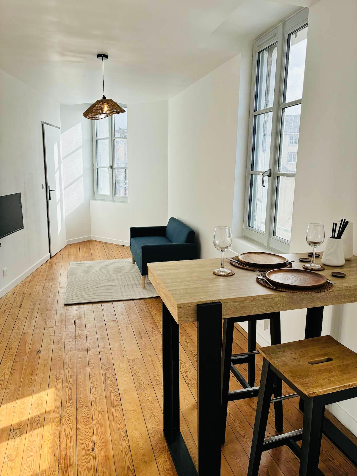 pequeno apartamento reformado de 25m2 com cozinha equipada (forno, máquina de lavar roupa, geladeira top, placa vitrocerâmica de 4 bocas, micro-ondas...) área de estar com um sofá-cama de 140, um quarto com uma cama de 160 (colchão de luxo novo de dezembro de 2022) + banheiro. Localizado perto do centro da cidade, suas lojas e lazer, a 45 minutos do Puy du Fou, a 1h15 do Futuroscope em Poitiers e a 35 minutos de Cholet. Entrada privativa e estacionamento nas proximidades.