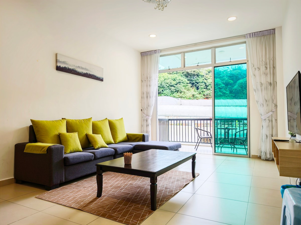 Facing greenery at highest floor in Brinchang town, Emeralds Avenue. 4 queens + 2 single beds for 10 pax & 3 baths. 3 car park near lift. Senior friendly. Fully fitted kitchen with Coway water purifier. Behind Centrum Mall. walking distance to more than 100 eateries, Burger King, KFC, Billion supermarket, wet& Cactus Valley. Free Unify & Netflix. 55” smart TV. We provide mahjong & carrom tables For 20 pax you can book connecting unit. EA922-Link https://www.airbnb.com/h/josplaceemera ma