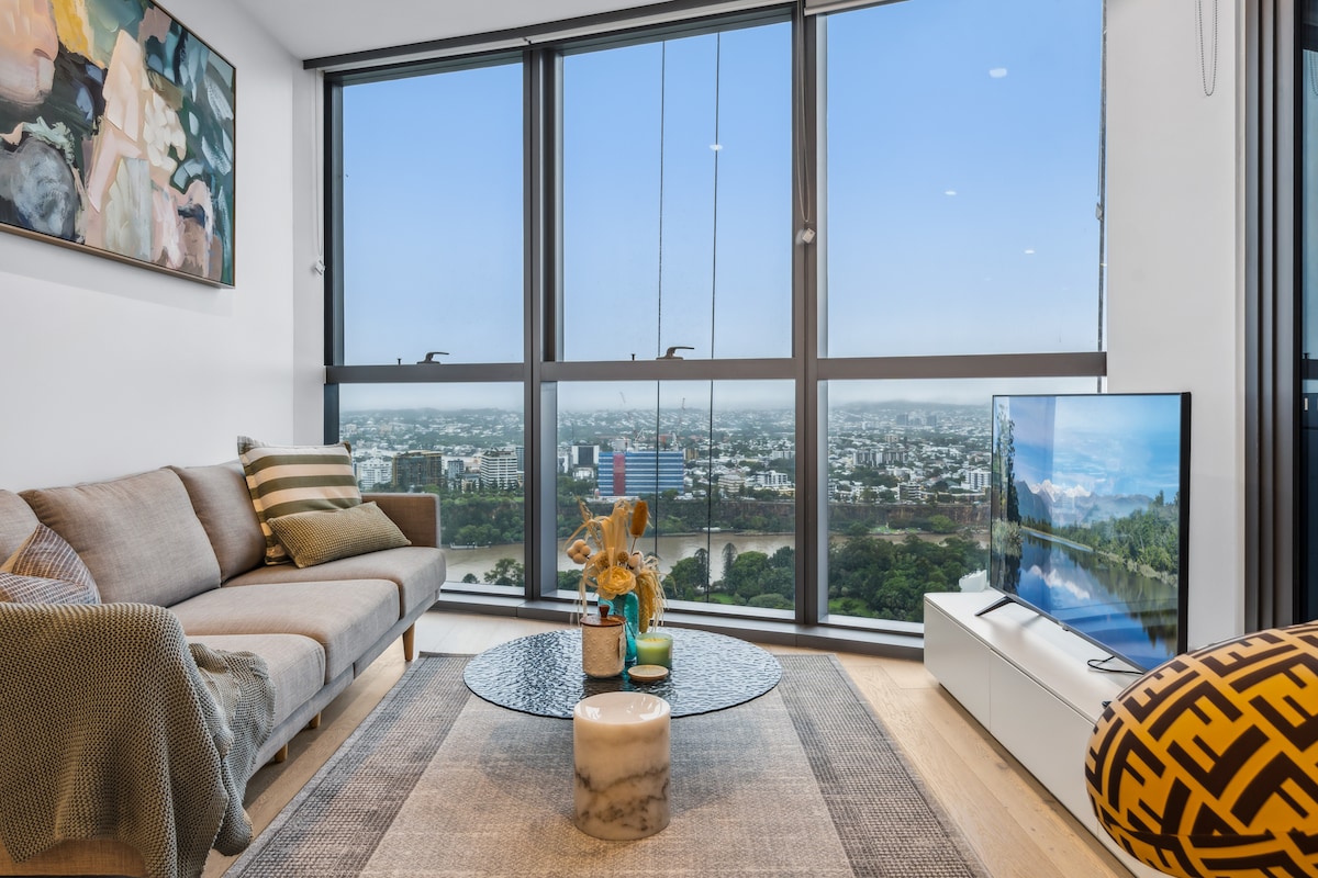 Desfrute de uma experiência premium no centro de Brisbane a partir deste apartamento de alto nível com vistas ininterruptas para o rio e a cidade. Relaxe na sua grande varanda privativa com vista para o rio Brisbane, Southbank e Queens Wharf, e desfrute de comodidades em estilo resort, incluindo uma piscina aquecida, academia, banheira de hidromassagem e sauna. Estacionamento seguro gratuito no local incluído. Com uma cozinha totalmente independente, internet de alta velocidade, um espaço de trabalho dedicado e lavanderia completa, esta é a base perfeita para viagens curtas e estadias prolongadas.