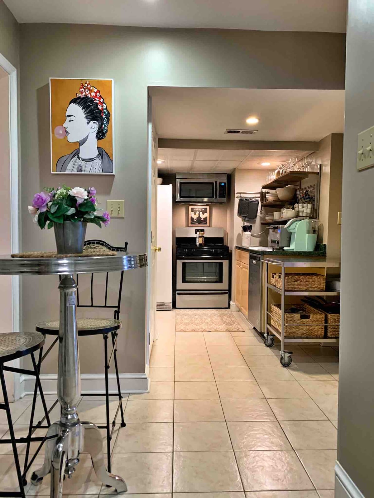 A casa fica em um bairro tranquilo e seguro. Você terá seu próprio quarto, banheiro, sala de estar espaçosa, trabalho, área de jantar, bem como uma cozinha acoplada com uma geladeira, uma cafeteira, um micro-ondas, um pequeno fogão elétrico portátil, pratos, tigelas, copos e utensílios para cozinhar simples. Você tem sua própria entrada para o espaço. A cozinha é o único espaço compartilhado para que o anfitrião possa acessar a lavanderia. As fechaduras estão instaladas em todas as outras áreas do andar térreo para garantir sua privacidade.