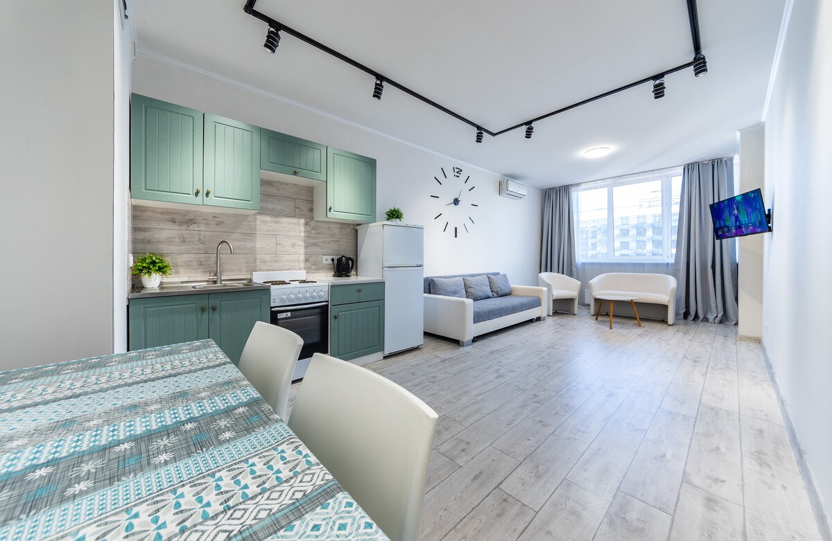 Apartamentos exclusivos (32 m ²) são feitos de acordo com o projeto do autor. O layout é dividido em 3 zonas: uma cozinha - sala de jantar, uma sala de estar e um quarto separado com uma área de trabalho (uma divisória de vidro oferece um espaço privado e isolamento acústico adicional). Equipado com todos os móveis e eletrodomésticos necessários. (ar condicionado, geladeira, máquina de café cápsula, TV, Wi-Fi, fogão, forno, lava-louças, máquina de lavar roupa, caldeira, secador de cabelo, filtro de água potável.