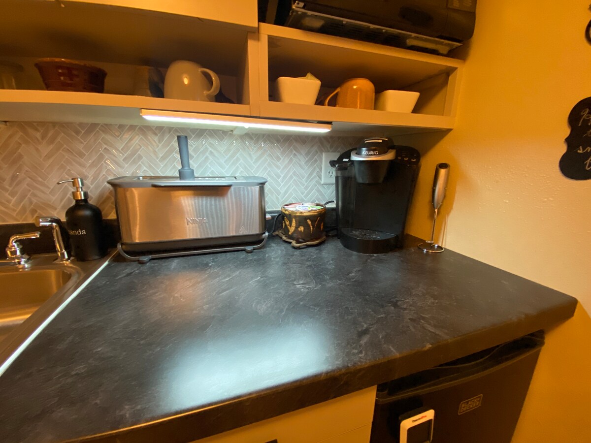 Nosso espaço de nível inferior foi projetado para oferecer tudo o que você precisa! É aconchegante e limpo! Você terá estacionamento gratuito na rua, sua própria entrada privativa, banheiro e cozinha fornecida com vários pequenos eletrodomésticos. Também há espaço de armazenamento. Self check-in com cofre eletrônico. Pessoas altas, cuidado - este é um espaço no porão! Os tetos são de 79 polegadas. O banheiro é ainda mais curto. Para quem sofre de alergia a gatos - temos gatos no andar principal, mas eles nunca são permitidos no espaço do hóspede. (Leia TODAS as informações do anúncio!)