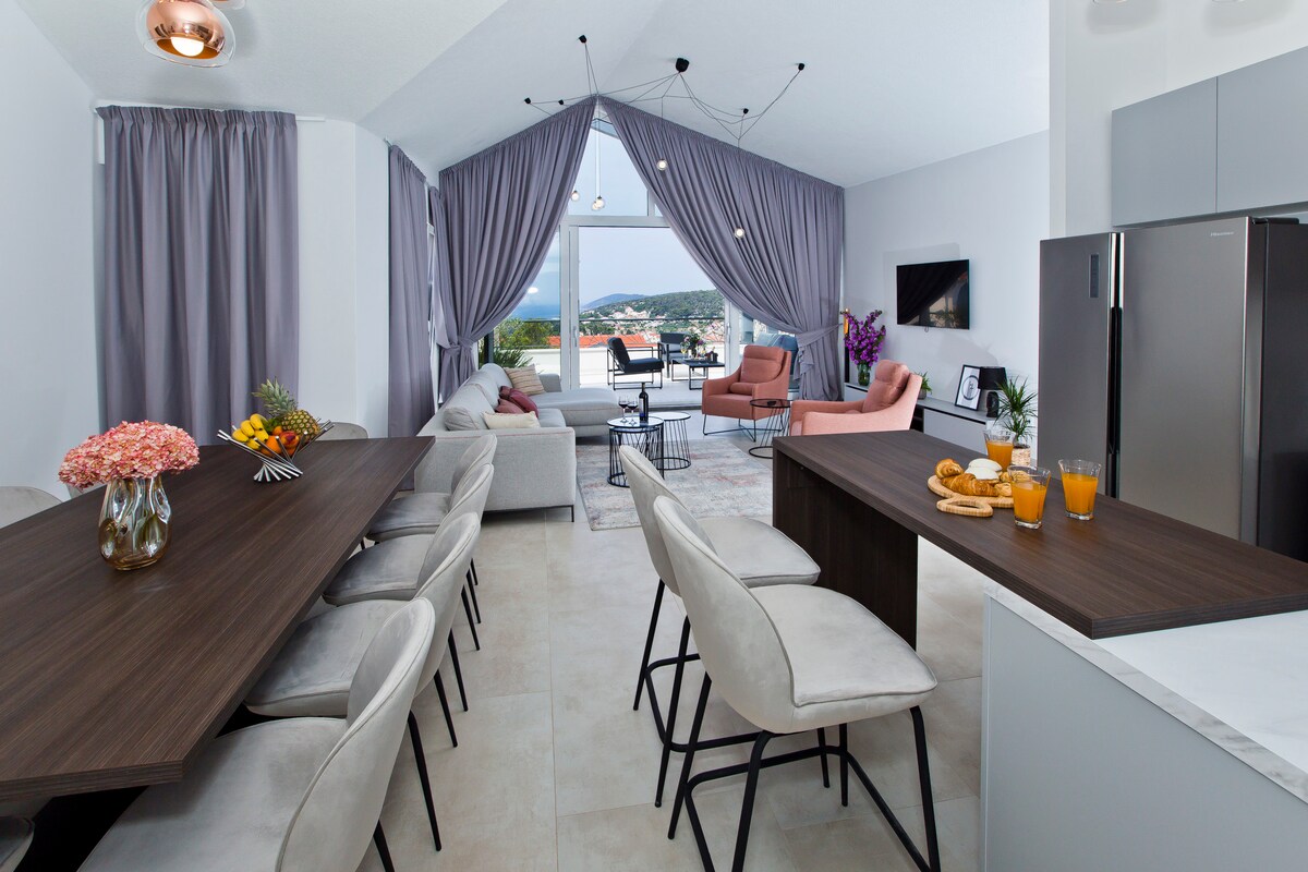 O apartamento "Memo" na cidade de Hvar é uma luxuosa residência de 136 metros quadrados para 6 pessoas, oferecendo vistas espetaculares do Mar Adriático e do arquipélago das Ilhas Pakleni!