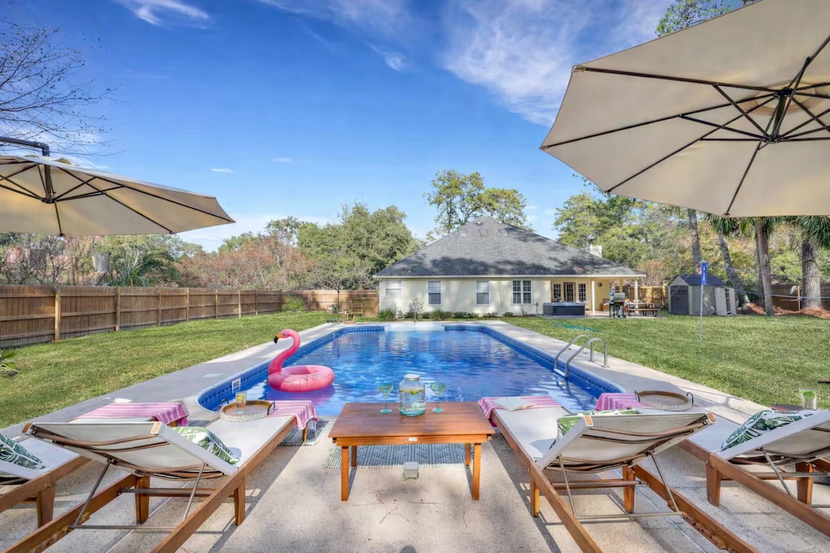 Savannah 5BR retiro! Mergulhe na piscina ou relaxe na jacuzzi. Ao ar livre, você vai adorar futebol, vôlei, badminton e nosso putting green. No interior, um paraíso para os amantes de caça: bilhar, pingue-pongue, pebolim, air hockey, shuffleboard. Desfrute de TVs ao ar livre e internas, espaço de trabalho dedicado, churrasqueira, mirante, frigobar e muitos jogos de tabuleiro. Conforto com 6 camas + 2 sofás-cama. Curta viagem de carro até o centro de Savannah e uma viagem panorâmica até as praias de Tybee. O melhor refúgio em grupo!