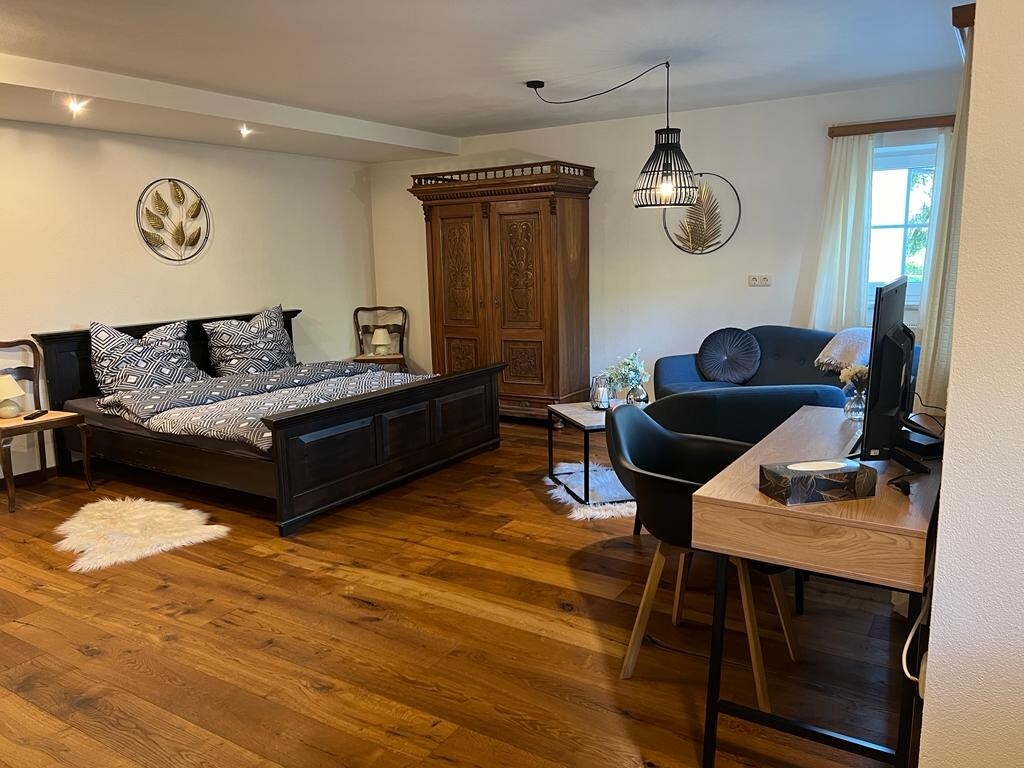 É um quarto de cerca de 13 metros quadrados, uma pequena cozinha aconchegante, com mesa e cadeiras e um banheiro com banheira, vaso sanitário e chuveiro. O quarto, bem como a cozinha, têm acesso à varanda e terraço, com vista para o lago Ammersee. Há também um espaço ao ar livre para relaxar na floresta adjacente, que também pertence ao apartamento. O carro pode ser estacionado no estacionamento subterrâneo. Uma trilha leva ao lago e ao calçadão da praia em 10 minutos