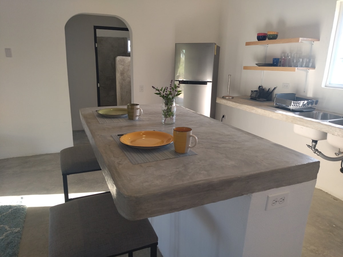 Casita del Sol is surrounded by mountains, Baja desert and Pacific Ocean vistas. Two private floors await your enjoyment, the sound of the surf will lull you to sleep each night. The casita is a romantic hideaway, with a kitchen and full bath. Candlelit dining table overlooks the sea. Sumptuous outdoor lounging area perfect for sleeping, reading, working or relaxing. An infinity-edge hot soaking tub awaits you up a spiral staircase on your private rooftop. The sunsets are spectacular!