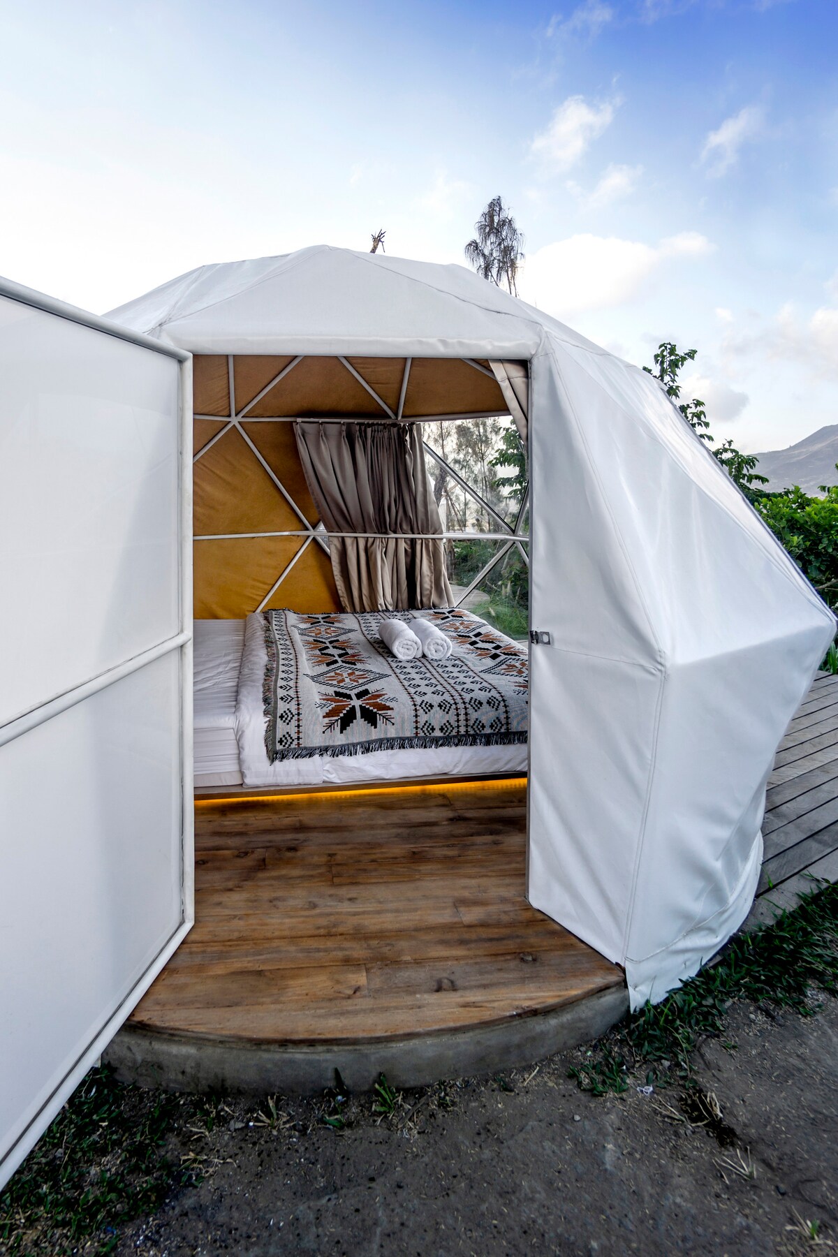 Experimente a beleza de viver no luxuoso glamping com uma vista deslumbrante incomparável de três montanhas e vistas para o lago em Kintamani Bali. Este elegante Glamping tem um design chique moderno com uma vista extraordinária, quartos iluminados. O Refúgio Perfeito para quem procura férias relaxantes no espaço confortável e elegante e desfrutar do cenário encantador deste local romântico na natureza ☑ Inclua café da manhã para 2 pessoas Cama de casal☑ aconchegante Vista para a☑ montanha e para o lago ☑ Restaurante de☑ Piscina Pública de Infinito