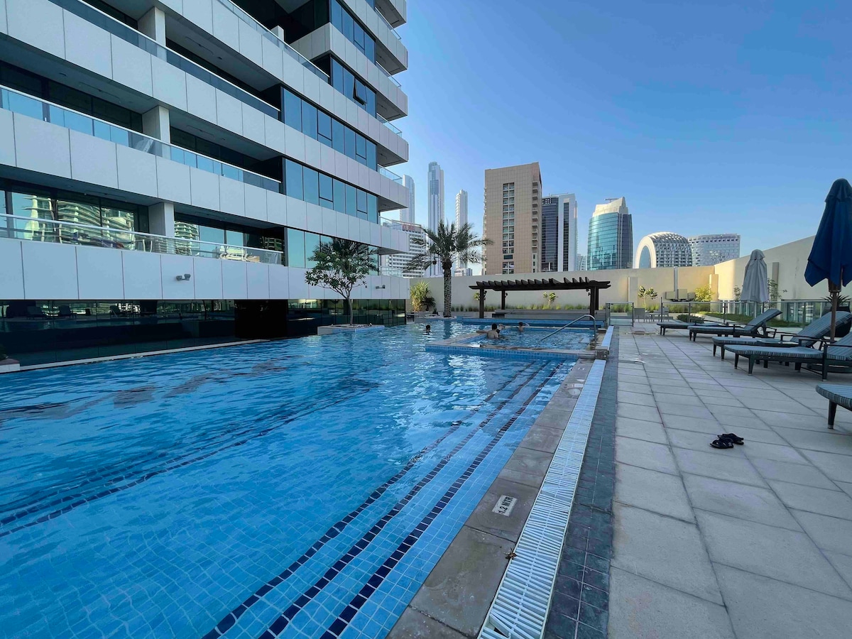 Estúdio acolhedor e luxuoso localizado no coração da área residencial em Business Bay com academia, banho turco, sauna e piscina de borda infinita no edifício. O apartamento está totalmente mobiliado para duas pessoas, cozinha aberta totalmente equipada e banheiro bonito. Vista incrível para o canal e para a piscina. Limpeza gratuita a cada 2 semanas O apartamento tem uma atmosfera acolhedora para garantir uma estadia serena e confortável: - Apartamento espaçoso de 436 pés quadrados, -Cozinha equipada com máquina de lavar roupa, Nespresso, micro-ondas, forno... - Wi-Fi de alta velocidade