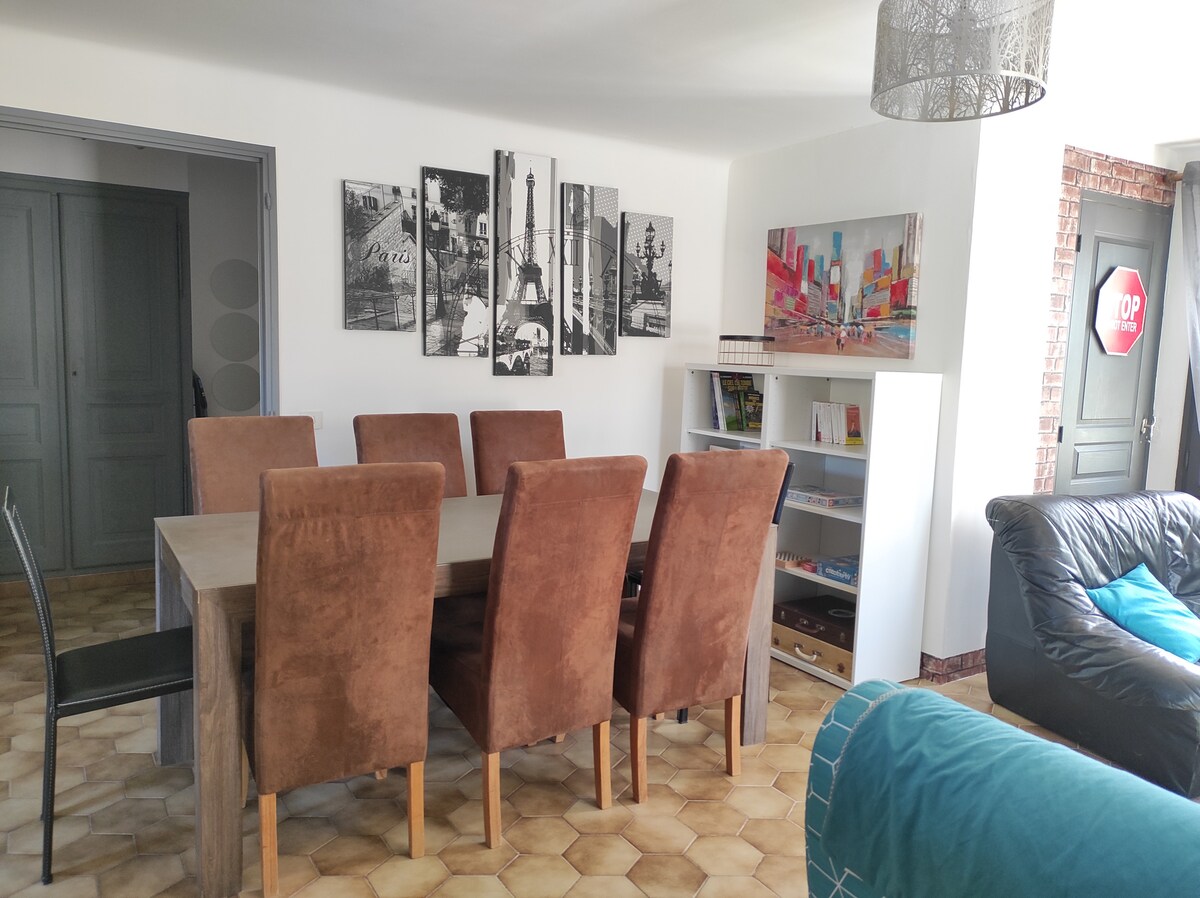 Hébergement en 2 parties (8+6 personnes) au total 14 avec entrée séparée pour chaque. Nous fournissons gracieusement pour chaque personne: 1 petite et 1 grande serviette , gel douche, draps. Machine à café SENSEO avec quelques dosettes) Lave-vaisselle quelques pastilles. Four, plaque chauffante électrique. Barbecue si autorisation préfectorale (charbon non fournis). 2 frigos/congélateur. Lave-linge sans lessive Terrain de pétanque Hôtes attenants au logement en duplex en cas de besoin.