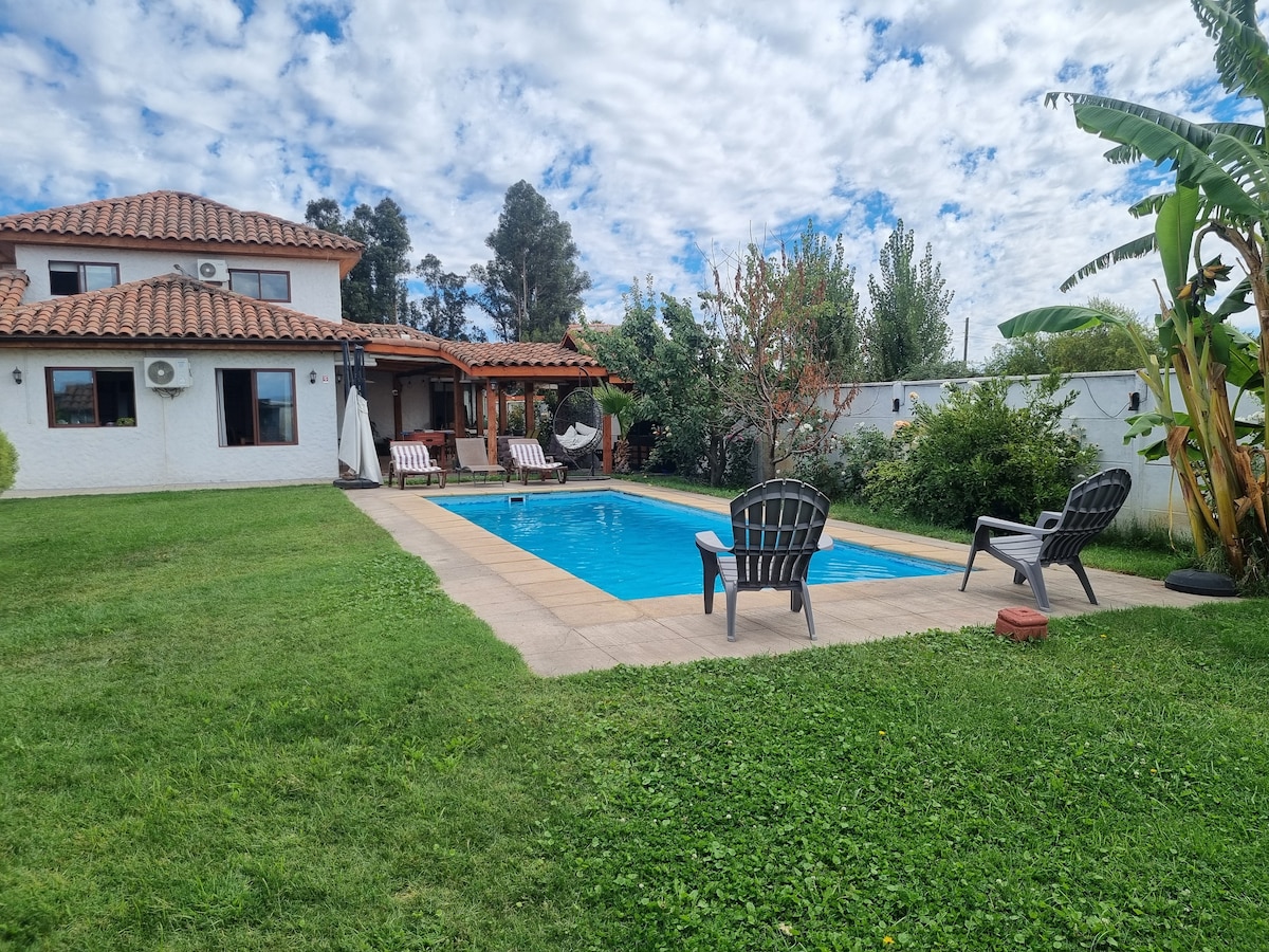 Olvídate de las preocupaciones en este gran alojamiento: Es un Oasis de Tranquilidad, Seguridad y Exclusividad. Ideal Parejas solas o con hijos Completísima Cabaña;Cama 2Plazas+2 camas singles, Aire Condicionado,TV,Wifi,Encimera, Refrigerador,Microondas,Hervidor,Ollas,Vajilla,Utensilios,jugueraTé,Café,Comedor Inter y Exterior Piscina,Tinaja🔥Quincho, Asador, mobiliario,Lindo Jardín,Árboles,Reposeras. CercanoViñas,Museos,Restaurantes,Lugares con Encanto,Historia y Tradición Chilena. Starlink 📶