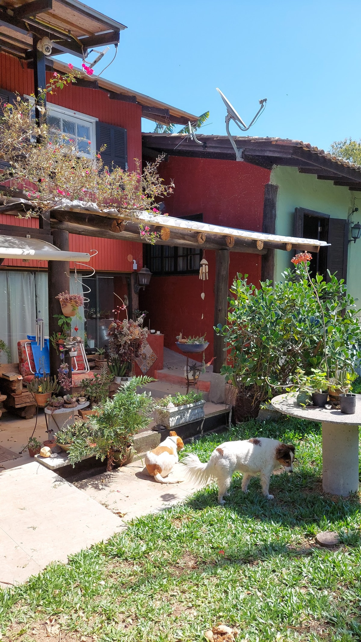 A suíte fica abaixo da casa do anfitrião, com total privacidade e ampla área externa (gramado, lago e parreira de uvas dependendo da época do ano que fizer a sua hospedagem). Terá a disposição diversas louças e talheres para preparar suas refeições se quiser. Além de uma geladeira, um freezer, um forno e um microondas. Ambiente conta com ar condicionado super forte para refrescar os dias mais quentes do verão. Internet wifi disponível.
